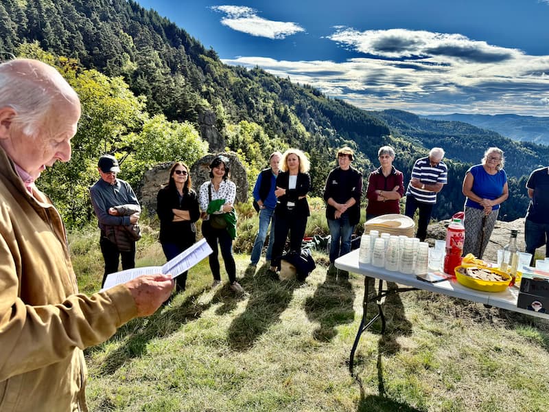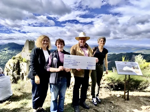 Samedi 4 octobre 2025, le chemin d’interprétation du château de Rochebonne a été inauguré par l’association Les Amis de Rochebonne. Roger Dugua, président de l’association a accueilli et remercié les propriétaires qui ont autorisé l’implantation des panneaux et les soutiens financiers qui ont aidé la réalisation de ce chemin d’interprétation. A cette occasion, les représentantes de la Caisse locale du Crédit agricole des Boutières ont remis un chèque de 3000 € à l’association.